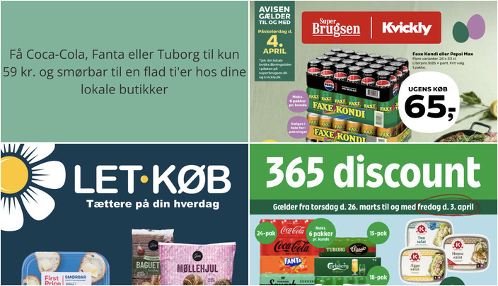 Coop365 tilbyder en række populære drikkevarer som Coca-Cola, Fanta, Tuborg Squash og Carlsberg til en skarp pris. Du kan få pakker med 15-24 x 33 cl til kun 59 kr. Tilbuddet gælder fra torsdag den 26. marts til fredag den 3. april, og der er en begrænsning på maks. 6 pakker pr. kunde.